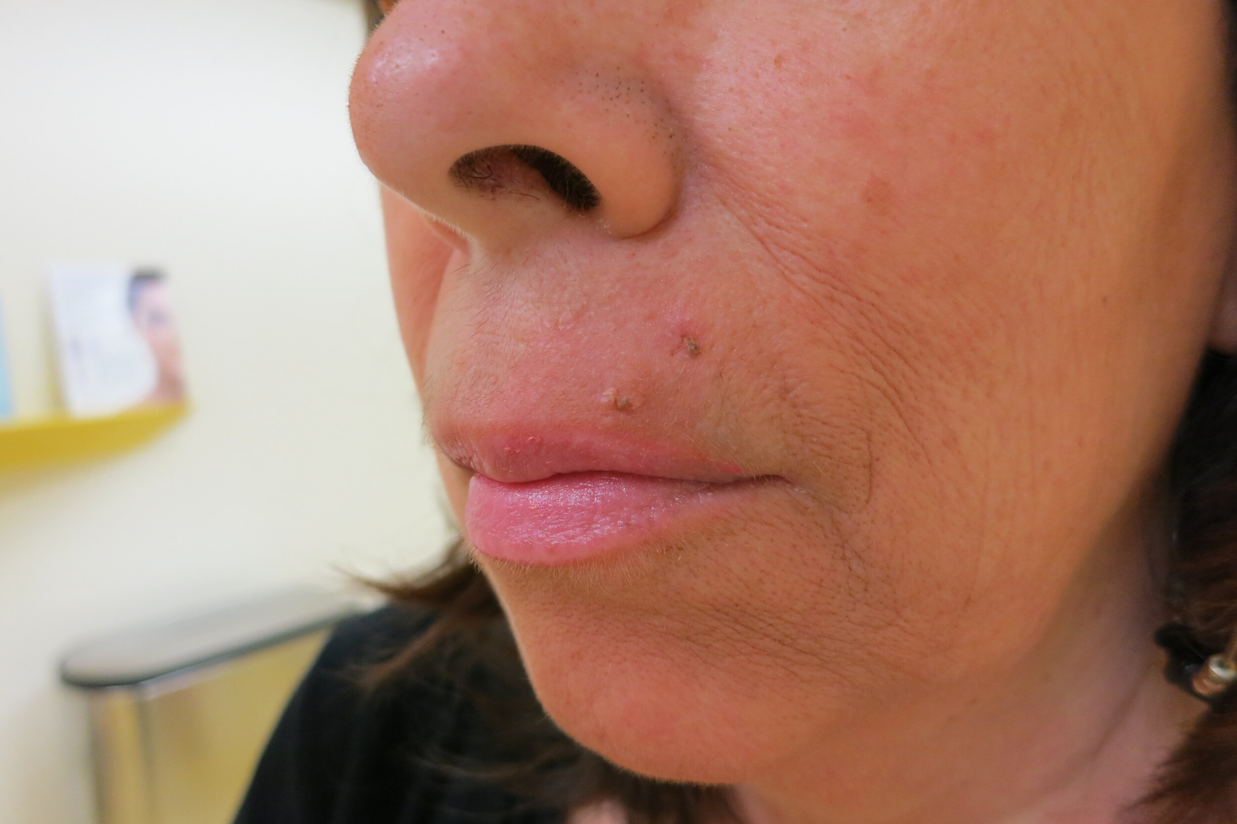 This patient underwent Mohs surgery with a dermatologist to remove a basal cell cancer from her upper lip. She required reconstruction with a flap from her cheek. The last photo is 2 months after the surgery. I often work in conjunction with dermatologist removing skin cancer to achieve the best reconstructive results. Her scars are all hidden and will continue to soften over the next few months.